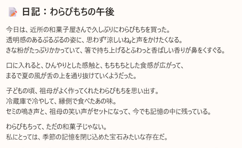 私が書くとしたらせいぜい「今日わらび餅を食べました。美味しかったです。」くらいの内容にしかならないというのに。